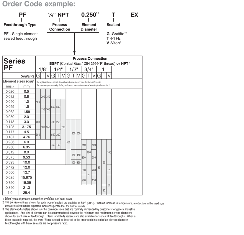 Series PF feedthroughs seal elements from 0.020" dia. to 1". There are five body sizes having 1/8”, 1/4”, 1/2”, 3/4” and 1” process connections with NPT threads. Contact us for other thread type availability.